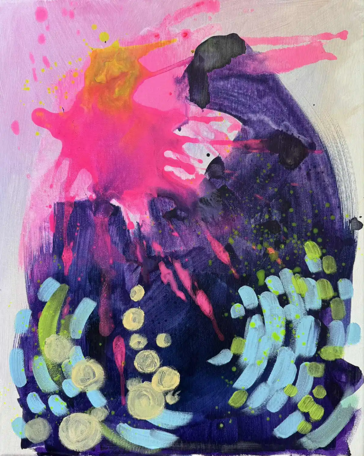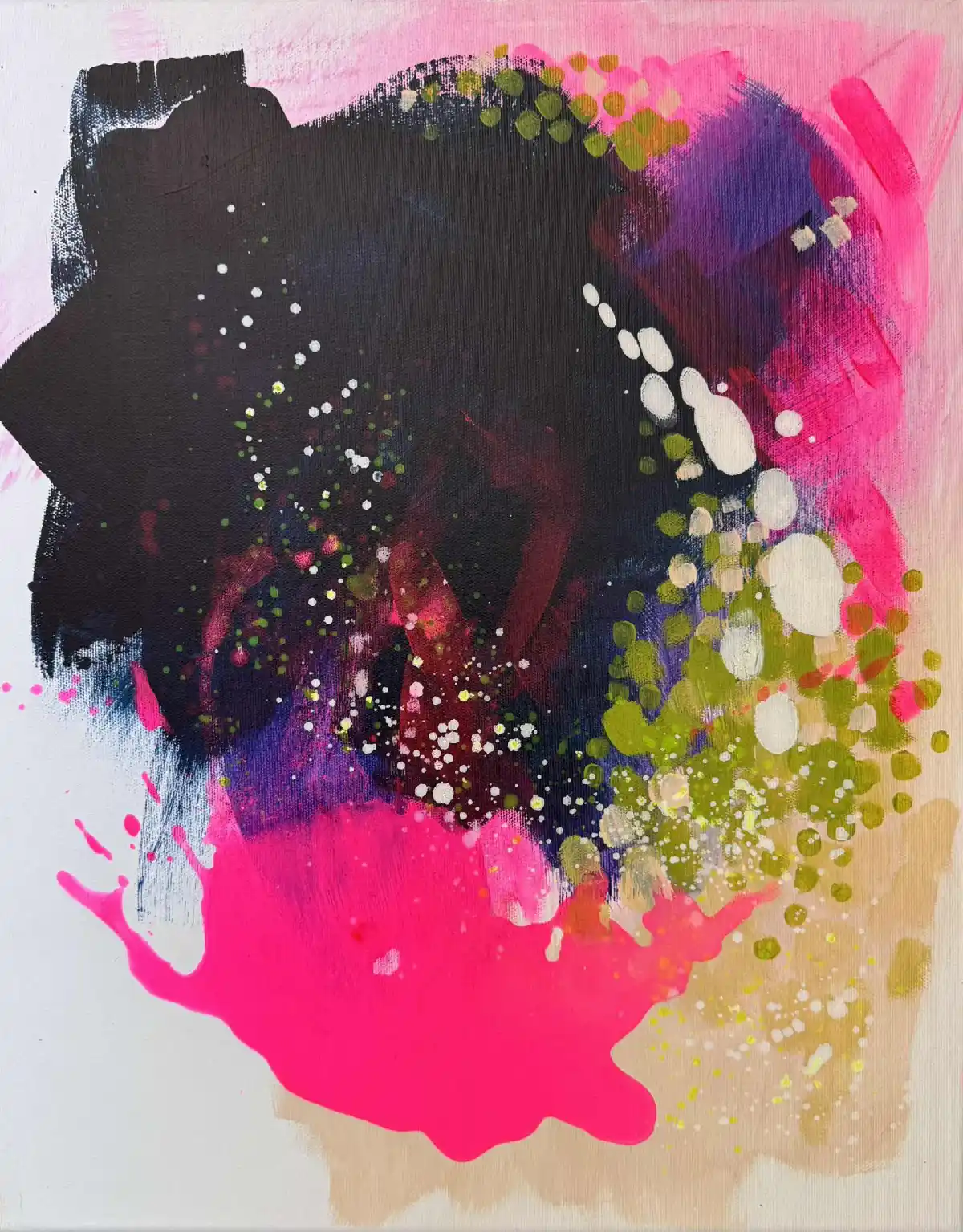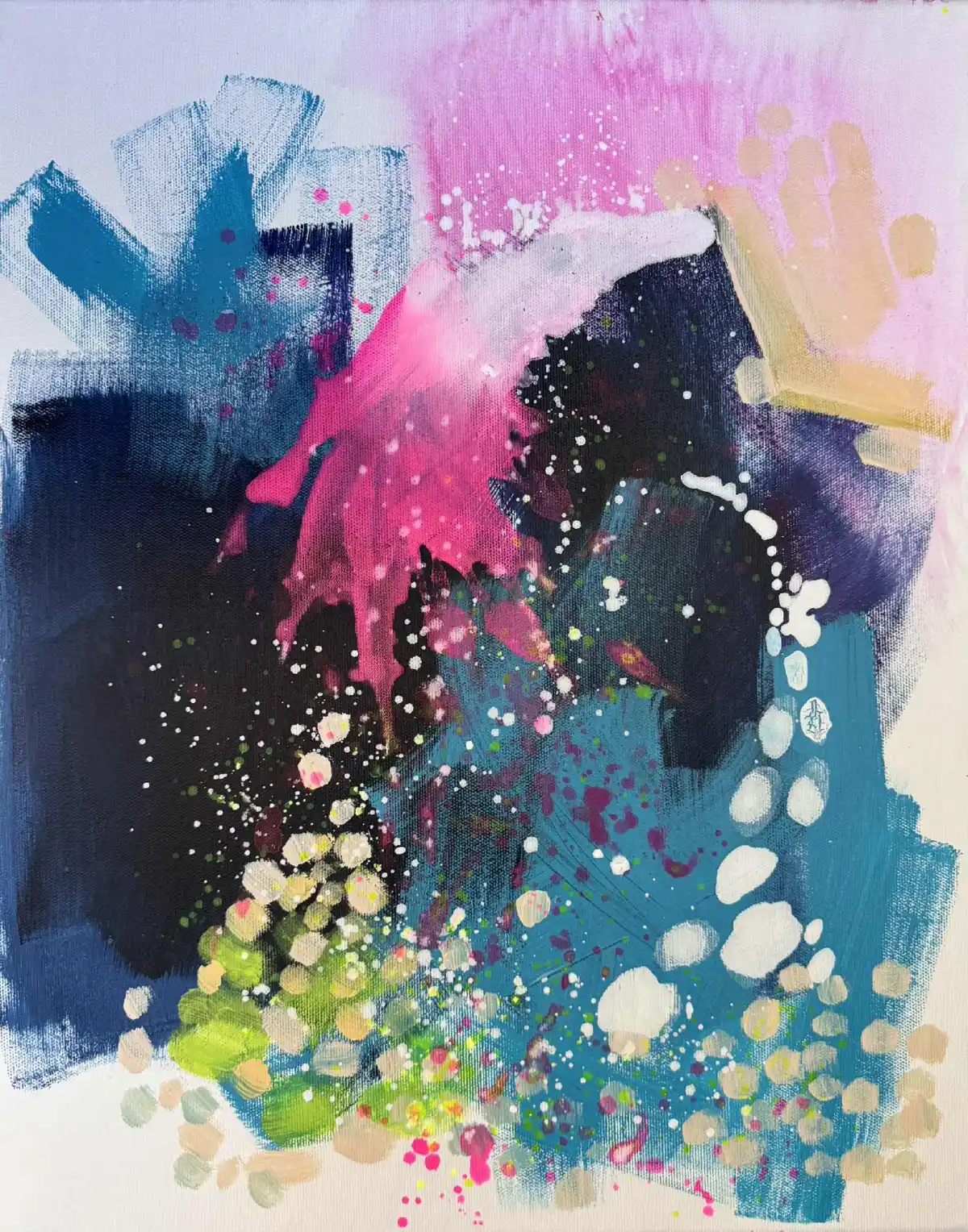 „Czas letni 1, 2 i 3” to zestaw trzech obrazów akrylowych, które tworzą spójną, pulsującą energią całość. Każda z kompozycji łączy intensywne neonowe akcenty różu i zieleni z głębokimi granatami i błękitami, przeplatanymi świetlistymi plamami bieli i żółci. Dynamiczne rozpryski farby oraz rytmiczne formy nadają pracom ekspresji i lekkości, przywodząc na myśl beztroskie dni lata pełne światła i ruchu.