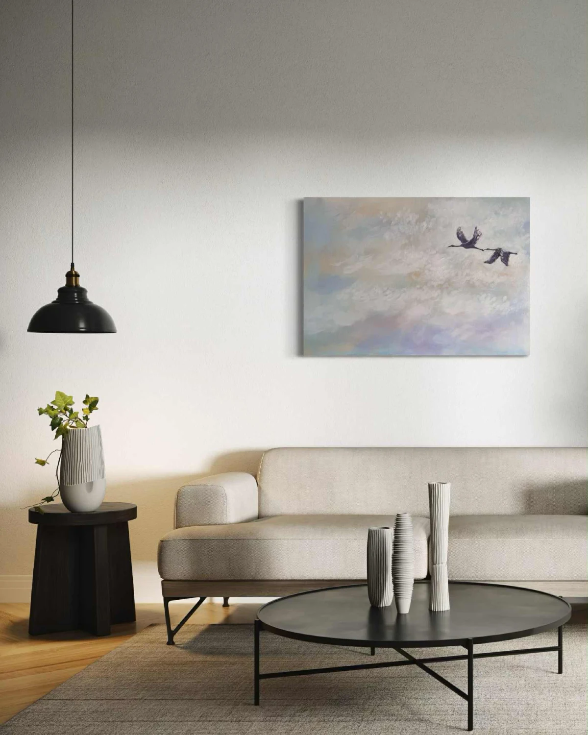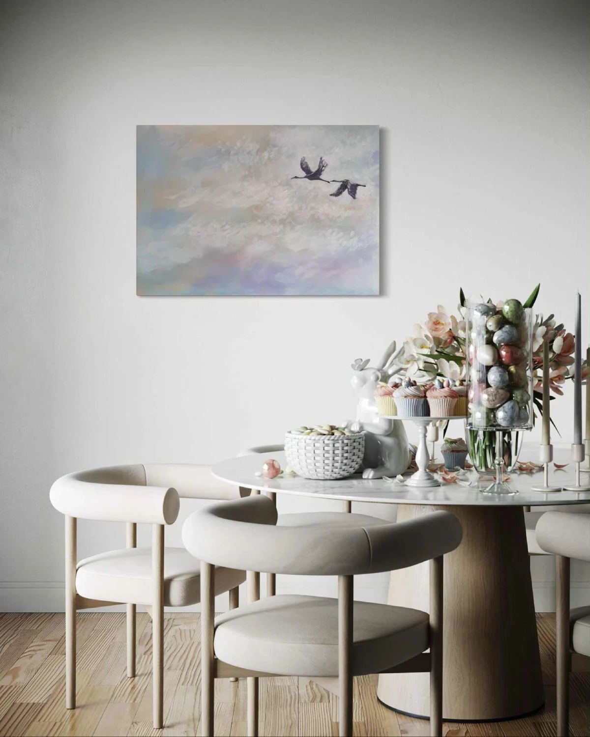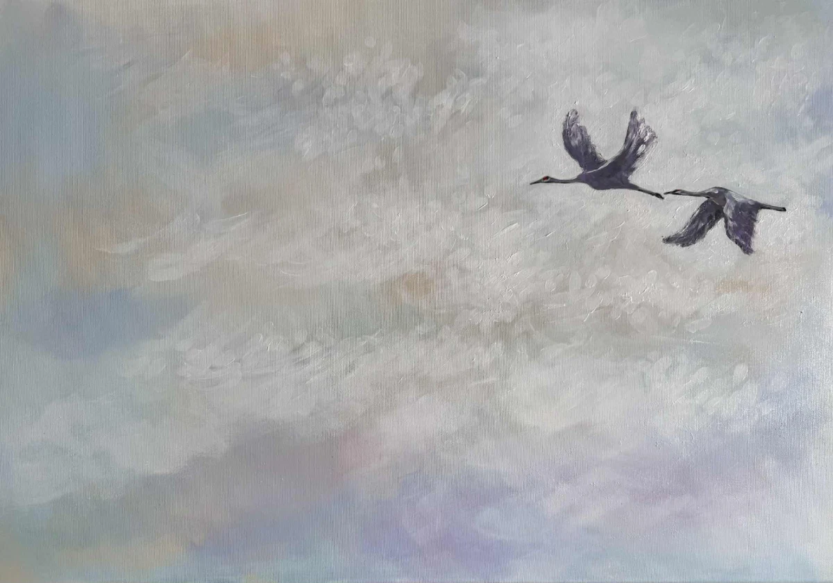„Do celu” to obraz akrylowy, w którym delikatne pastelowe odcienie nieba tworzą tło dla dwóch ptaków unoszących się w powietrzu. Miękkie pociągnięcia pędzla budują atmosferę lekkości i przestrzeni, sprawiając, że scena wydaje się niemal oniryczna. Subtelne światło przełamuje chłodne tony, wprowadzając aurę spokoju i nadziei.