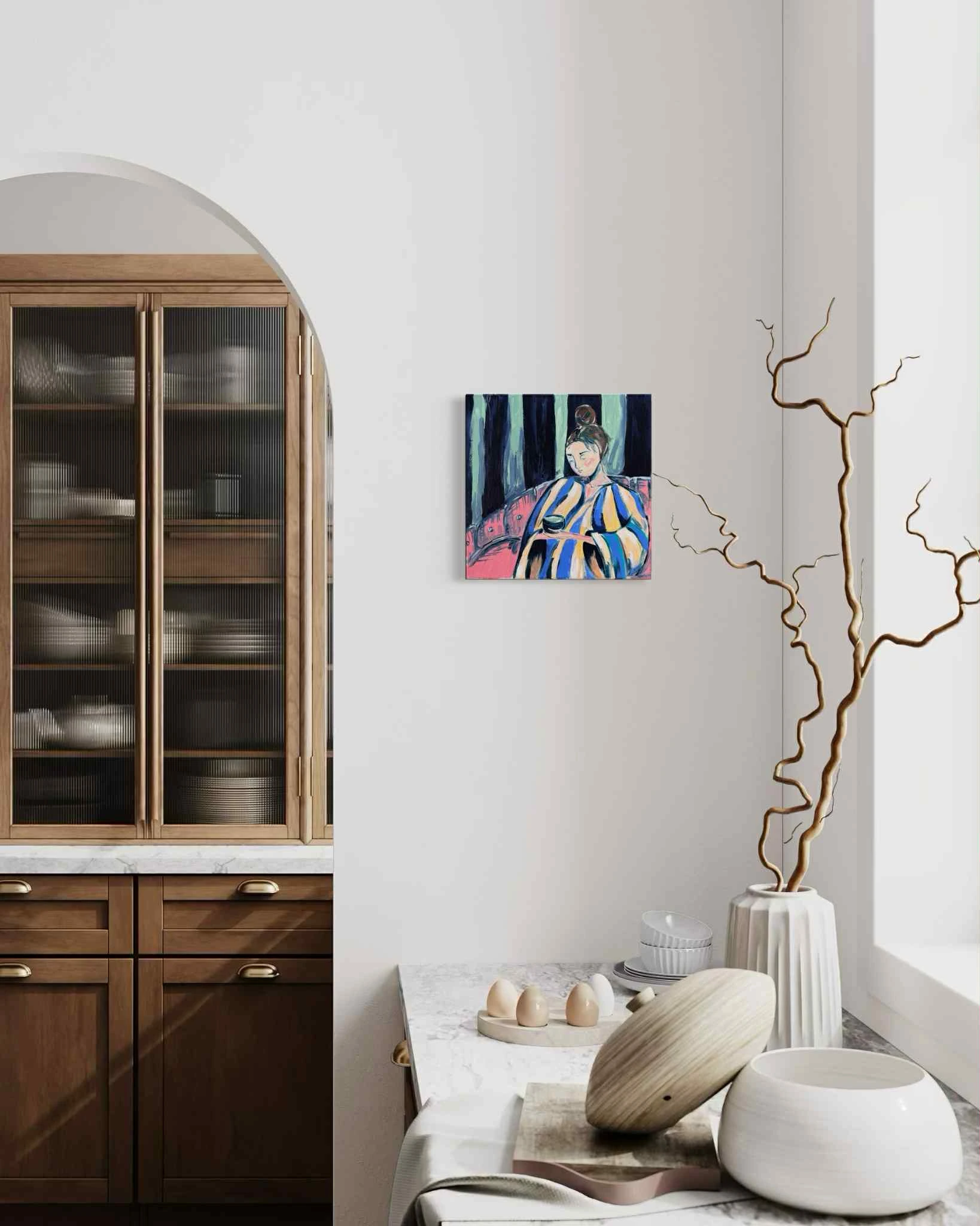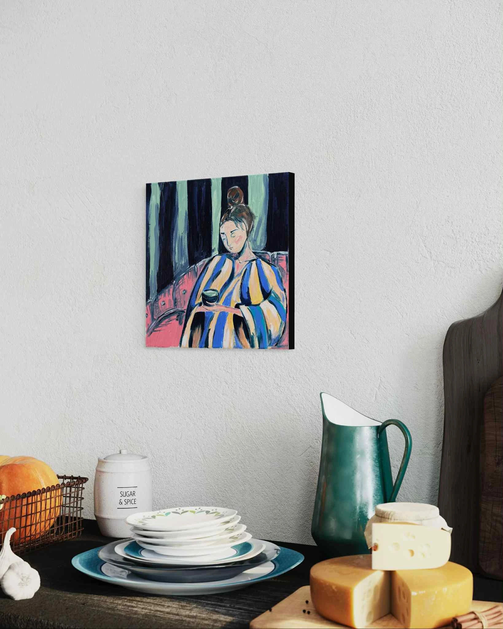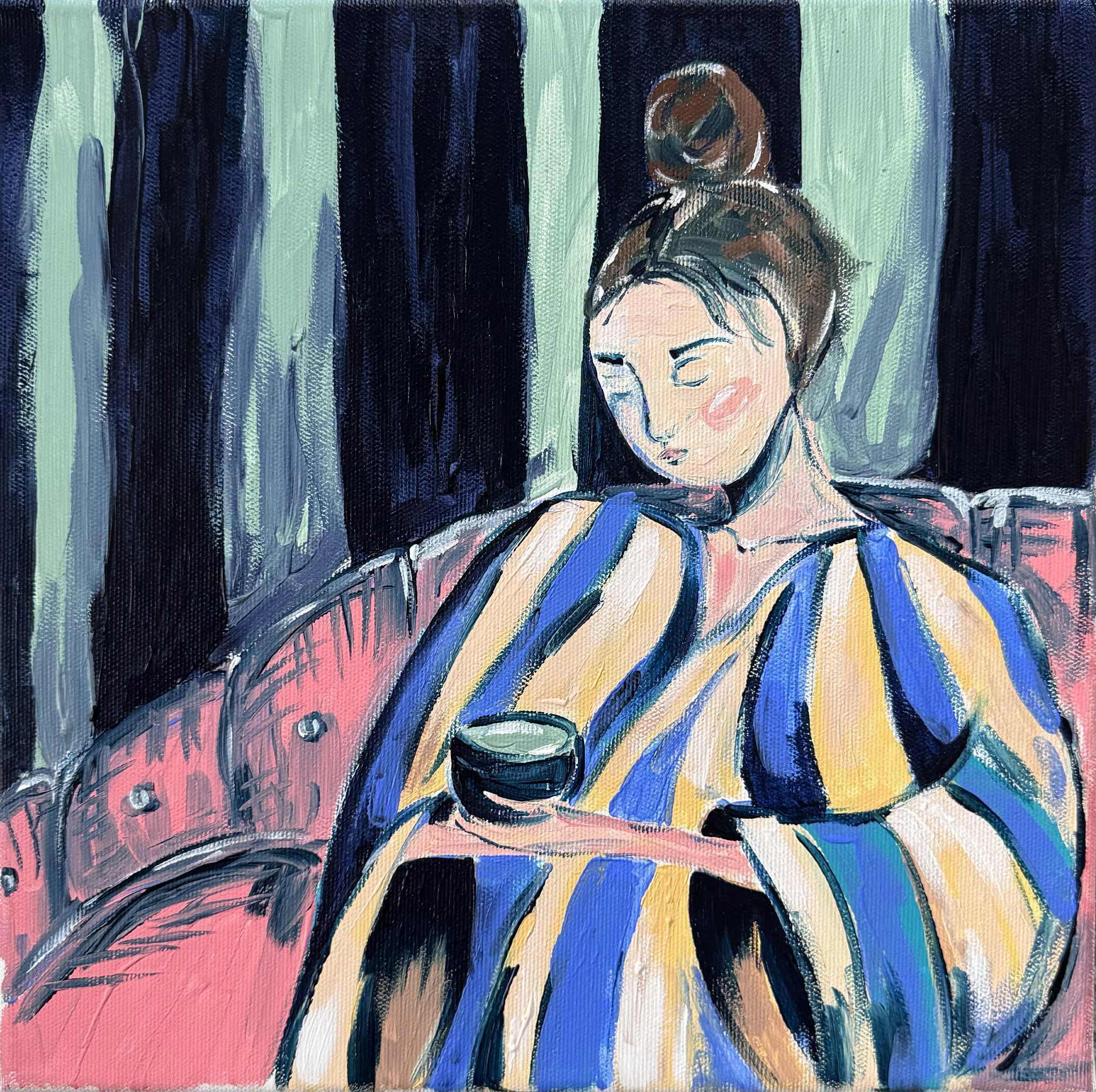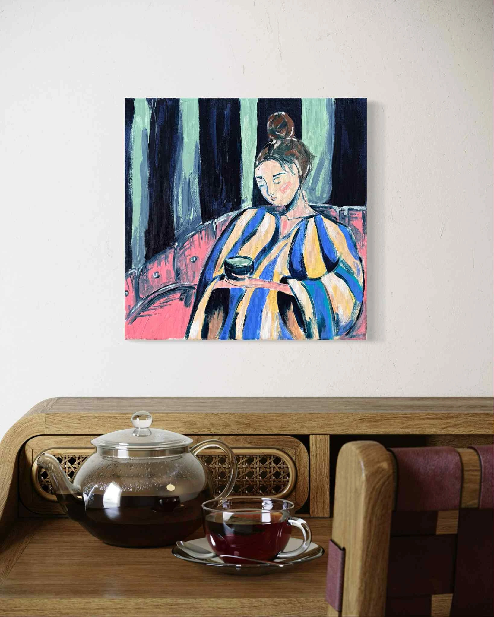 „Matcha” to intymna opowieść o chwili zatrzymania i ciszy, która mieści się między oddechami. Obraz przedstawia delikatny rytuał skupienia. Kobieta na obrazie trwa w swoim świecie, z filiżanką zielonej herbaty w dłoniach, jakby wsłuchana w wewnętrzny rytm serca.