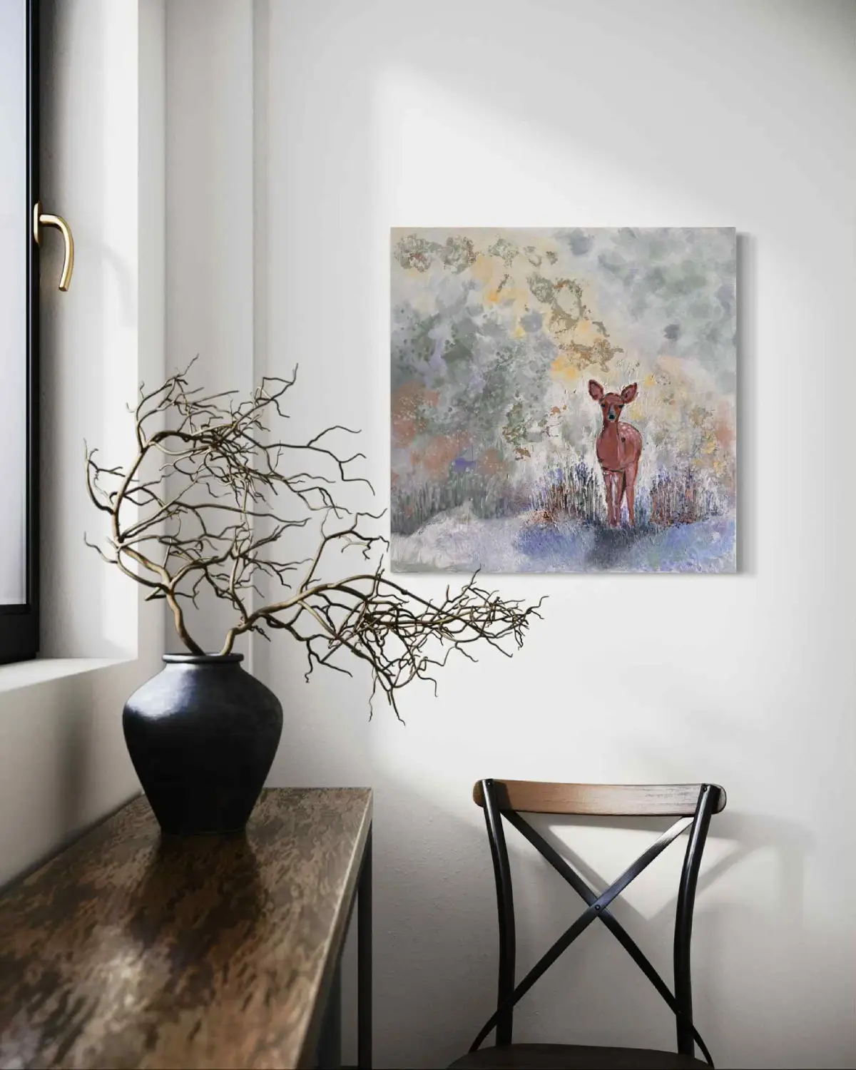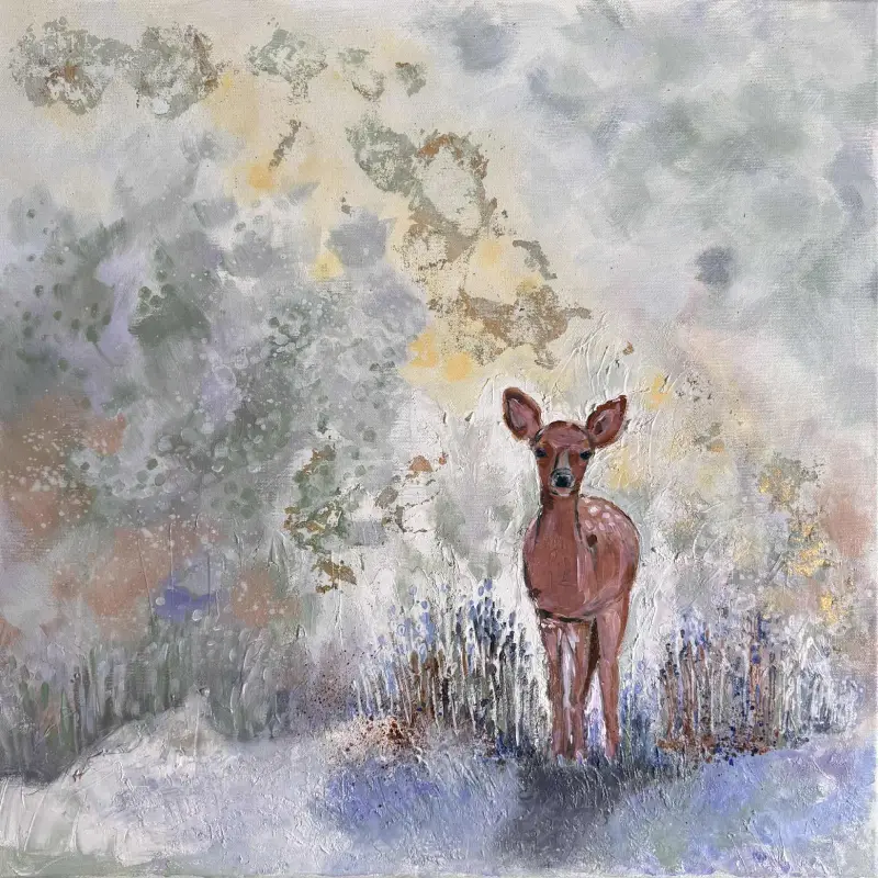„Ufność” to obraz akrylowy, w którym delikatne odcienie szarości, beżu i fioletu tworzą tło dla postaci młodej sarny. Fakturalna powierzchnia nadaje kompozycji głębię i organiczny rytm, podczas gdy sylwetka zwierzęcia – pełna prostoty i naturalnego wdzięku – staje się centralnym punktem dzieła.