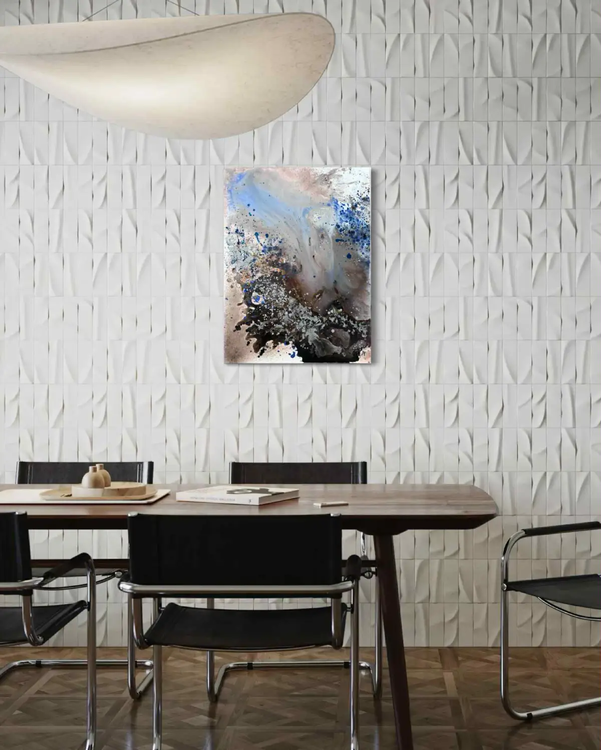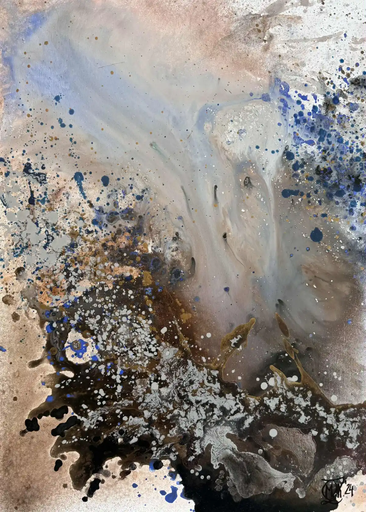 „Wszystko płynie 1” to obraz akrylowy, w którym srebrzyste i piaskowe odcienie spotykają się z głębokimi brązami oraz subtelnymi błękitami. Kompozycja pełna rozprysków i rozlewających się plam przywodzi na myśl wodę w ruchu, zderzenie fal z ziemią oraz nieustanną grę żywiołów.